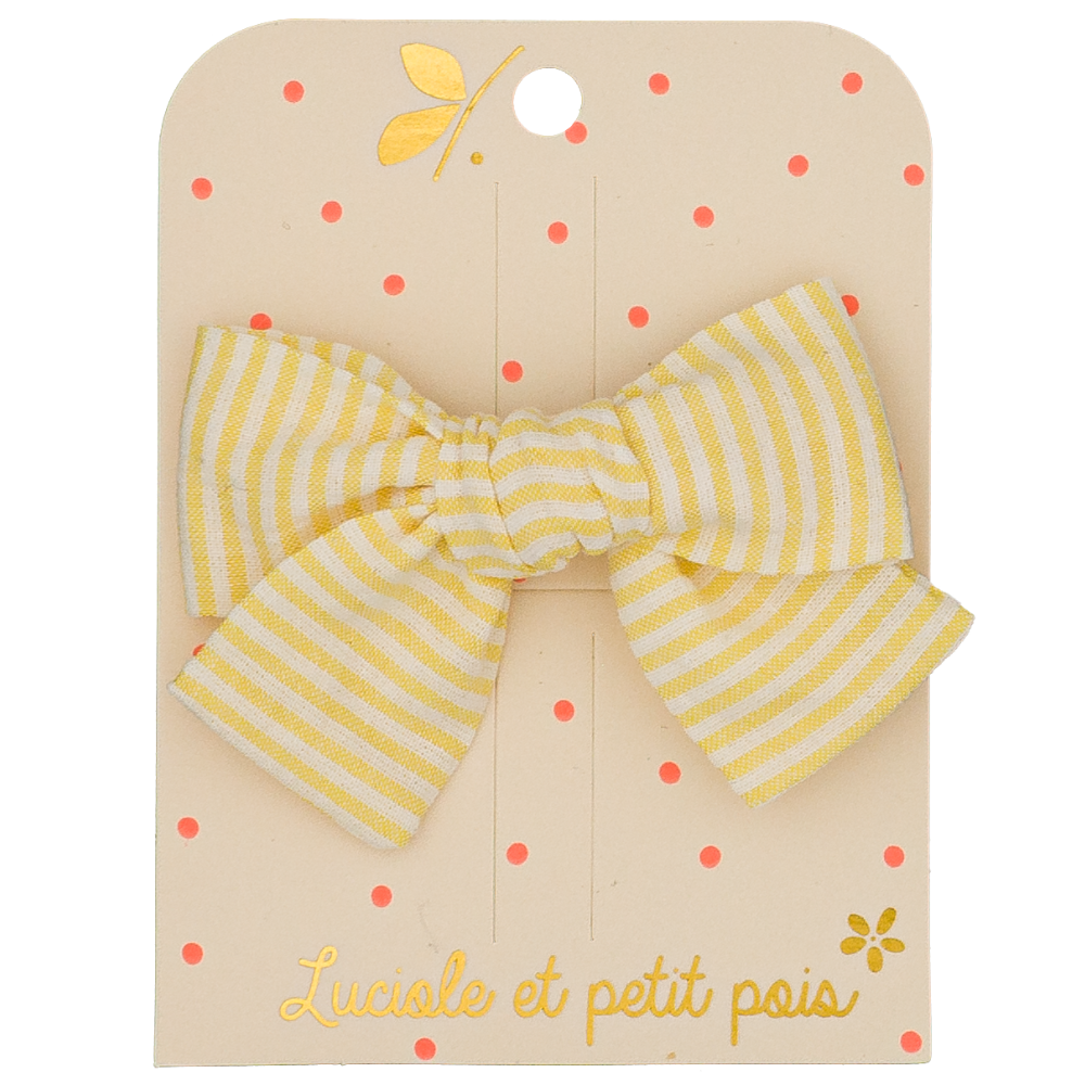 Pleine de peps, cette barrette nœud princesse en coton rayé jaune apporte une touche lumineuse et estivale aux coiffures !
