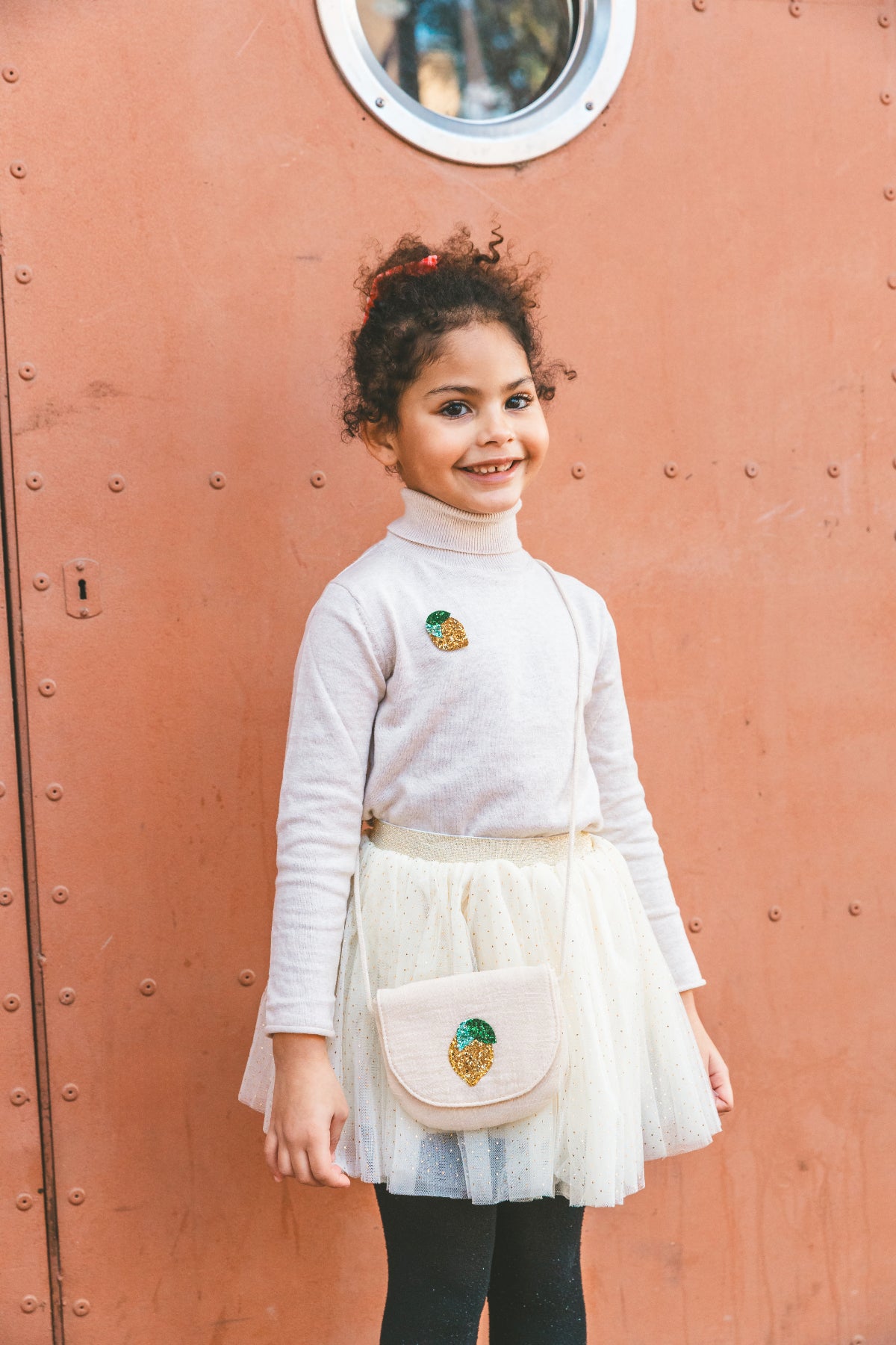 This ecru cotton handbag, enhanced with a glittery lemon on the flap, is perfect for a sparkling and vibrant look. It's great for storing little treasures.