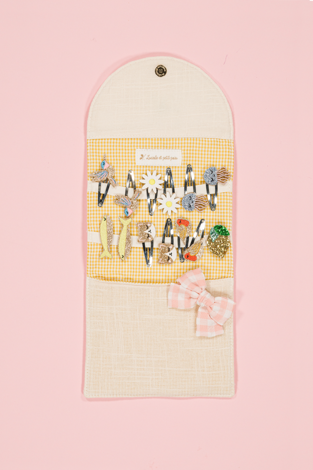 Cette pochette dépliable ornée d'un citron pétillant est parfaite pour voyager sans perdre ses trésors. Elle permet de clipser toutes les barrettes facilement.